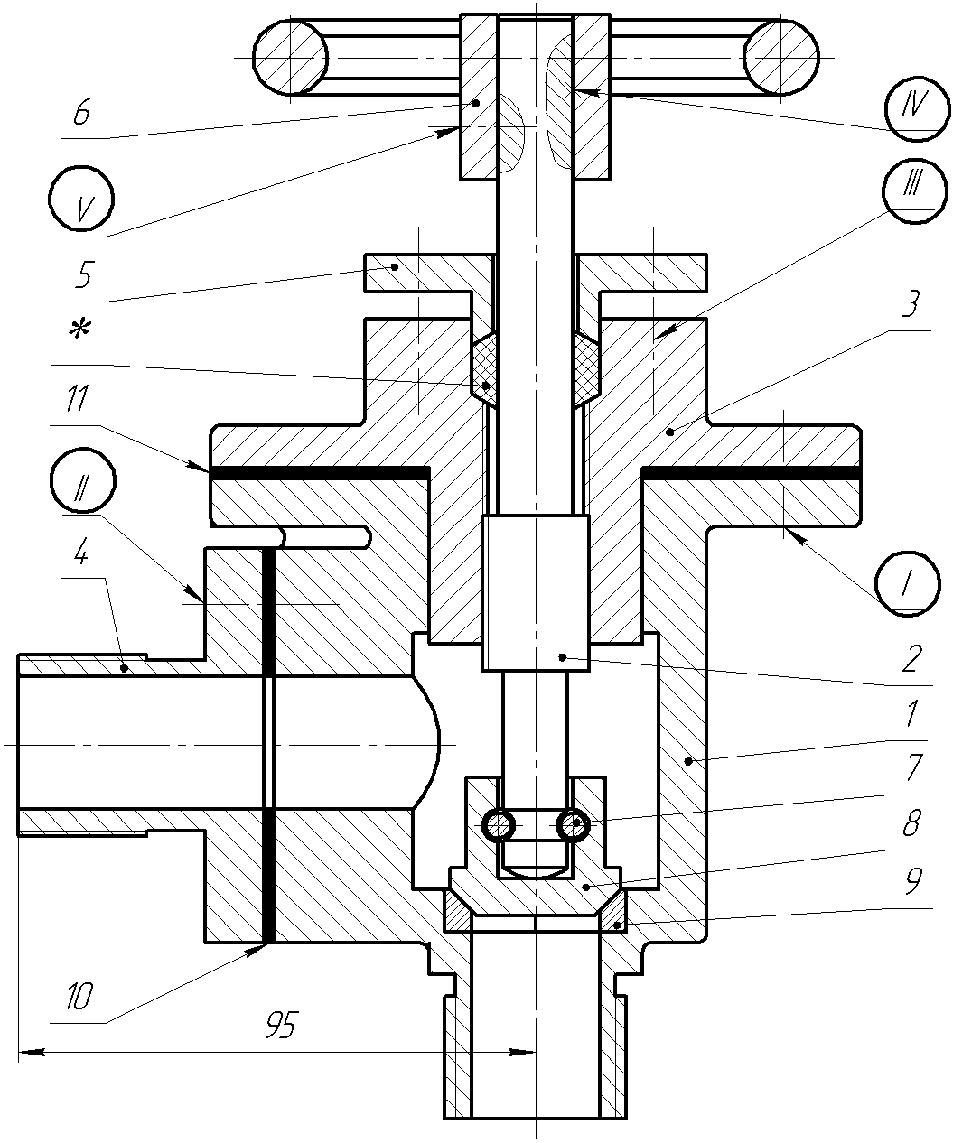 В состав вентиля входит материал, отмеченный знаком "*", «Пенька ПС ГОСТ 5152-66», в количестве 0,02кг. Все составные части указать в спецификации и на чертеже, номера позиций нанести в соответствии с требованиями ЕСКД (на карточке задания это выдержано нестрого). | ||||||
