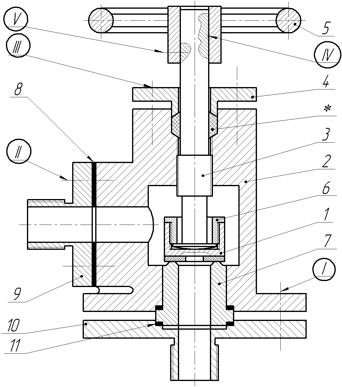 Материал «Пенька ПС ГОСТ 5152-66» (количество 0,02 кг.) отмечен значком «*». На сборочном чертеже и в спецификации каждая составная часть должна быть отмечена номером позиции. На сборочном чертеже номера позиций следует поставить в строгом соответствии с правилами ЕСКД. | ||||||