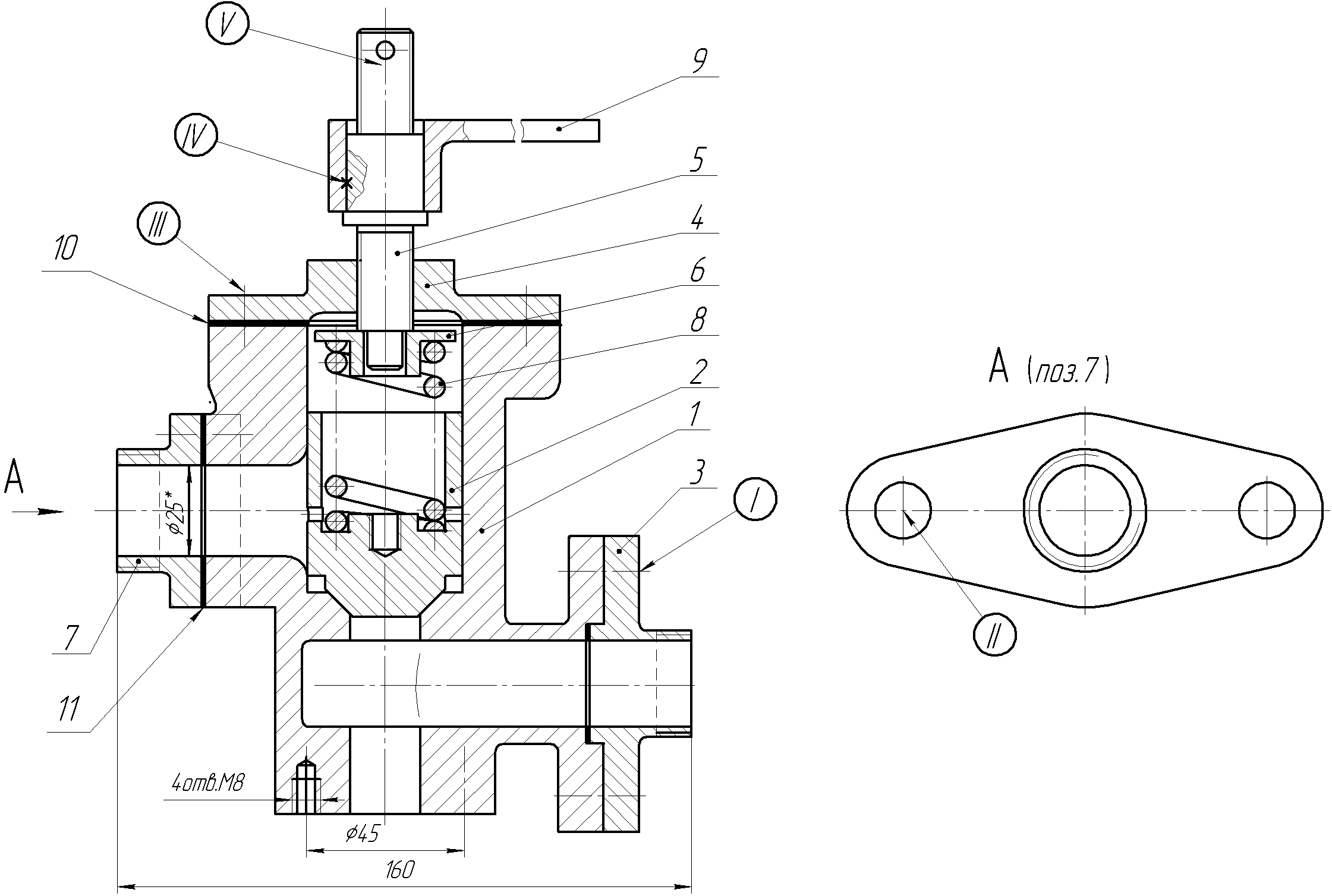 | I | Фланец поз. 3 с корпусом поз. 1 | Болты по ГОСТ 7805-70, Резьба М10х1,25, 4 шт. | Сталь 30 | Цинковое хромат. | - | |