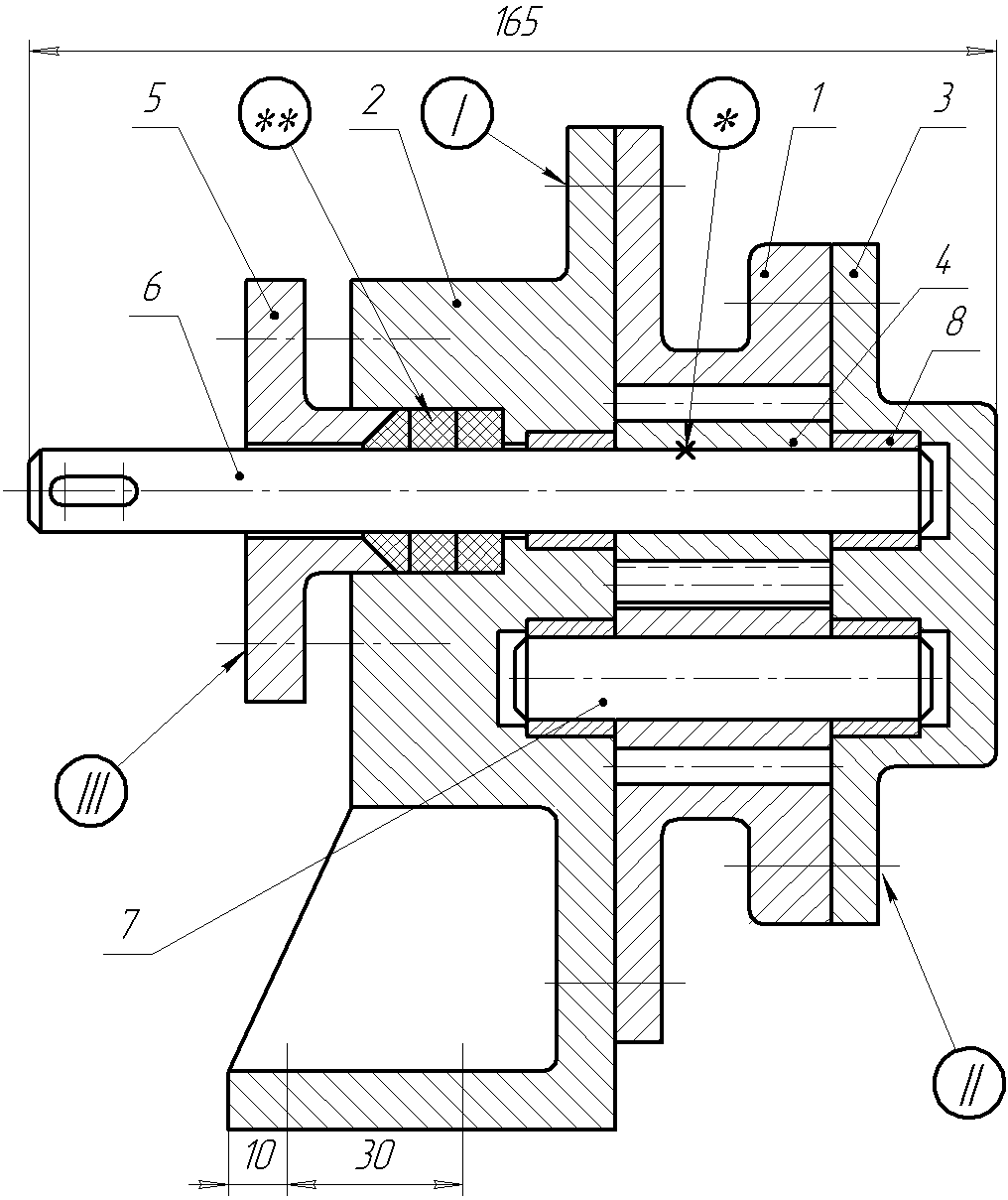 | На сборочном чертёже изобразить отмеченное цифрой "IV" соединение зубчатого колеса поз.2 с валом поз.3 (Шпонка 12х8х30 по ГОСТ 22360-78). В состав опоры вала входят стандартные изделия: “Подшипник ... ГОСТ 333-59”, 2 шт.; “*” “Кольцо СП 42-29-5 МН 180-61”, 4 шт. “**” Все составные части указать в спецификации и на чертеже, номера позиций нанести в соответствии с требованиями ЕСКД (на карточке-задании это выдержано нестрого). | ||||||
